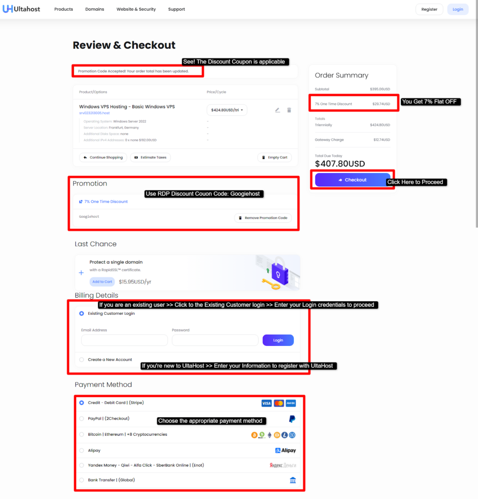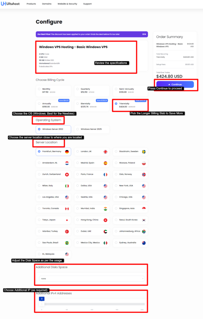 Here, we have chosen Ultahost as it offers a 30 days Free RDP trial) and it offers the latest SSD storage technology, Unlimited Bandwidth, 99.99% guaranteed uptime, Advanced DDoS for securing the connections, and many more.
